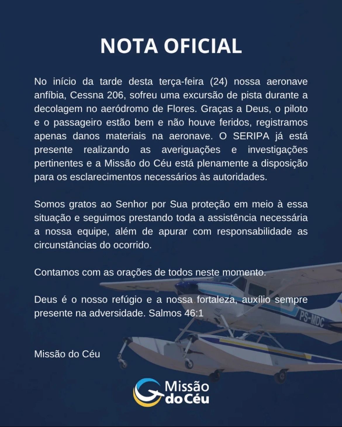 Segundo a Missão do Céu, o piloto e o passageiro não sofreram ferimentos e ambos passam be. foram registrados apenas danos materiais na aeronave.